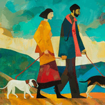 A pair of figures, accompanied by their dogs, stride confidently across a landscape that is a vibrant collage of abstracted natural forms. The man and...[+]