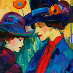 Two figures, adorned in stylish hats and cloaked in garments of rich blues and reds, share a moment of silent conversation against a backdrop of vivid, abstracted floral forms. Their profiles suggest an air of elegance and contemplation, with the brim of their hats nearly touching, creating an intimate space amidst the surrounding burst of colors. The painting is infused with the spirit of Fauvism, characterized by its use of intense colors, bold patterns, and the emotional depth conveyed through powerful brushstrokes.