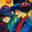 Two figures, adorned in stylish hats and cloaked in garments of rich blues and reds, share a moment of silent conversation against a backdrop of vivid...[+]