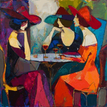 Three figures are seated around a table, engaged in what seems to be a private, convivial exchange. Their large, stylish hats in shades of red and purple tilt towards each other, creating a sense of intimacy. Each figure is adorned in brightly colored clothing, with a notable contrast between the warm reds and oranges and the cool purples and blues. Wine glasses on the table suggest a leisurely atmosphere. The composition is alive with Fauvist energy, using vivid, non-naturalistic colors and dynamic, flowing lines to convey the social energy of the scene.