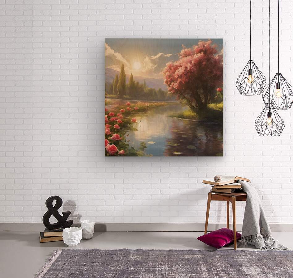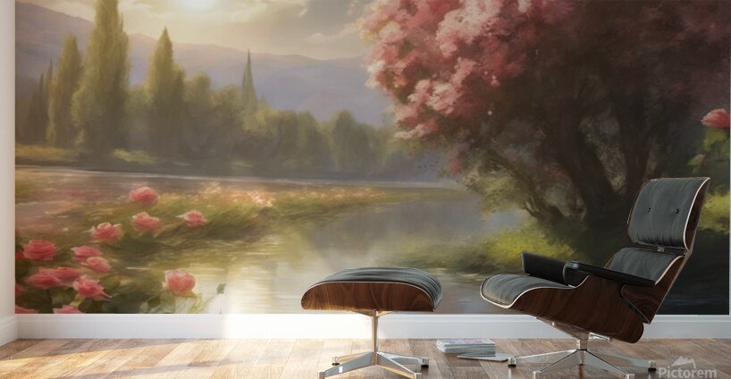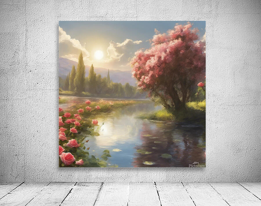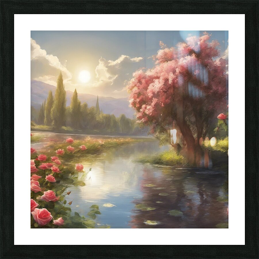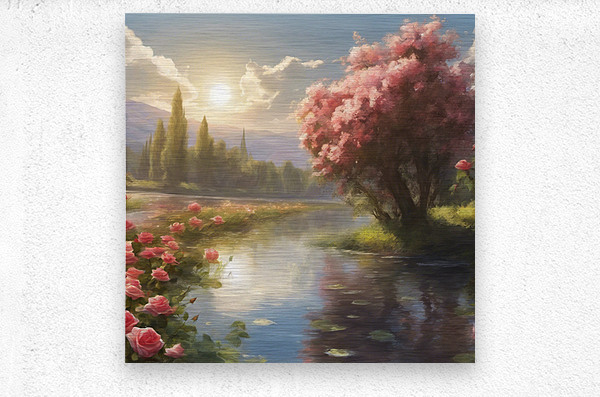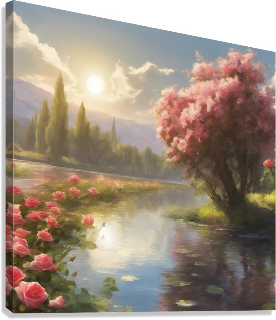 beautiful landscape ,sun, trees ,roses,river