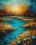 cosmic sky fantasylandscape wonderland wide shot painting oel on canvas, in the style of turquoise and gold, heavy use of palette knives, mbole art