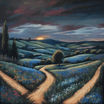 A tranquil countryside scene at golden hour, rolling hills bathed in the warm glow of the setting sun, a winding dirt road leading into the distance, fields of wildflowers swaying gently in the breeze, invoking a feeling of nostalgia and serenity, Painting, acrylic on canvas