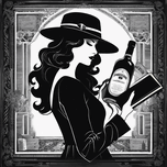 A monochrome vintage-style illustration featuring an elegant woman in a hat holding a bottle of alcohol with detailed ornate framing