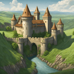 Medieval castle on a cliff, surrounded by a moat and rolling green hills, majestic, medieval, high detail