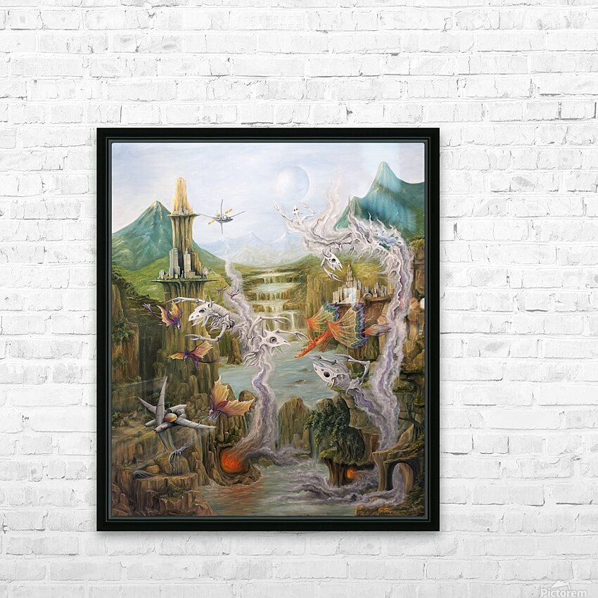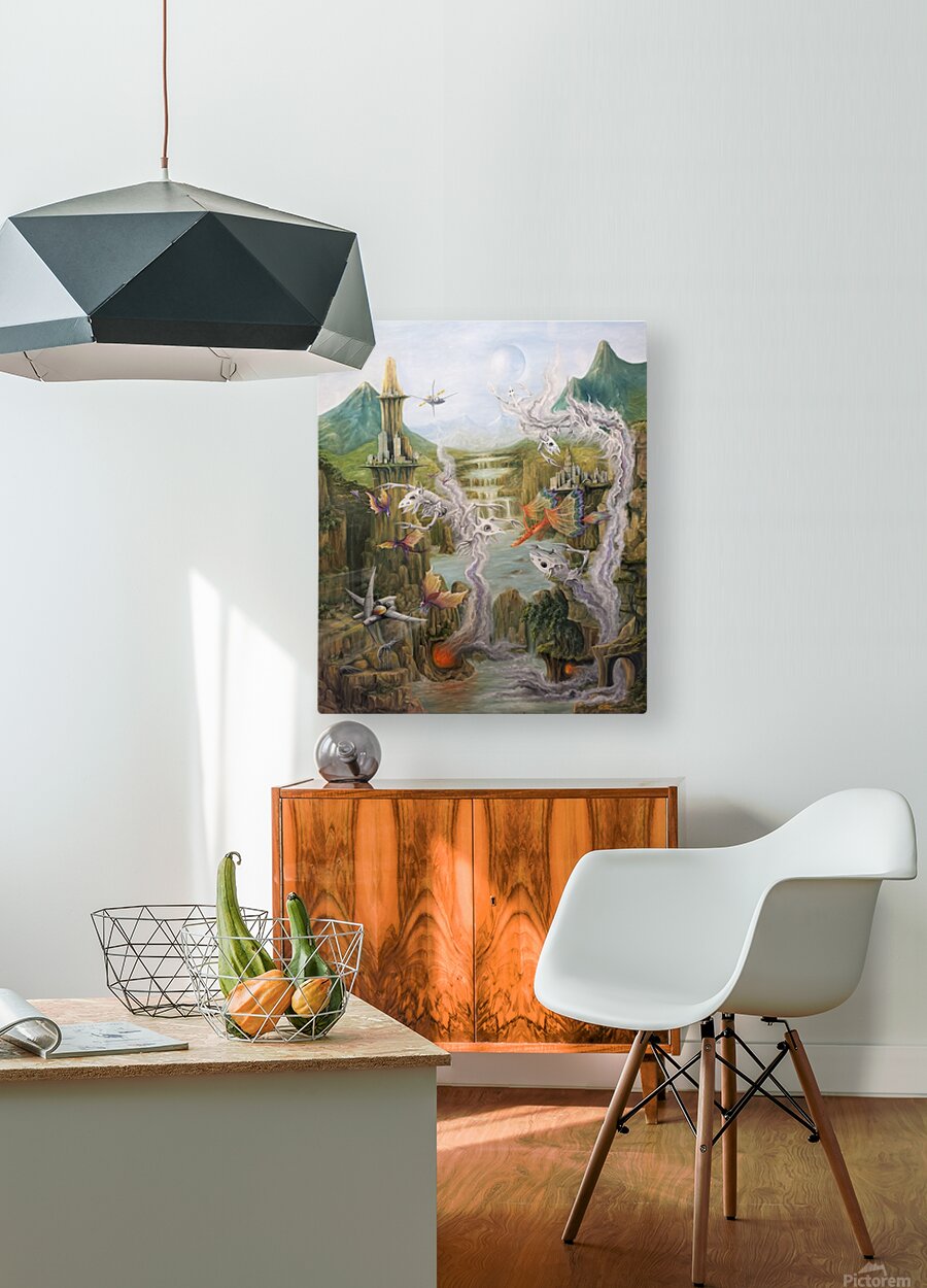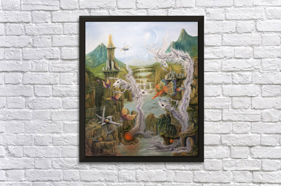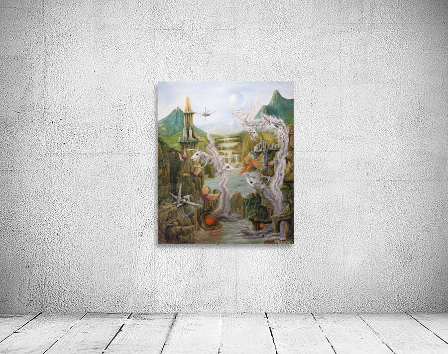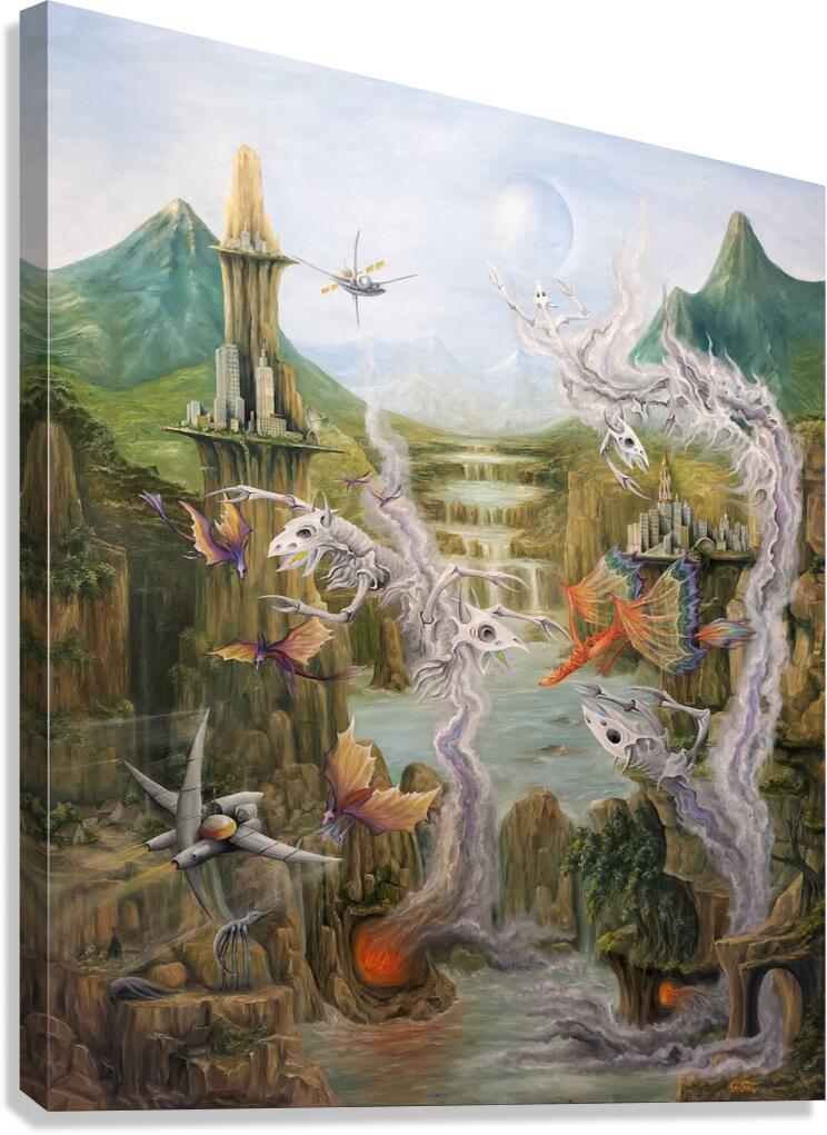 This artwork by Gregory Pyra Piro depicts a surreal landscape on a planet from a distant solar system. The inhabitants appear to be from different timelines, with flying dragons, demons emerging from smoke and fire, and other beings flying vehicles and spacecraft. The painting includes mountains, valleys, streams, lakes, and waterfalls, with a blue and white moon in the sky. It is signed by the artist on the front bottom right.