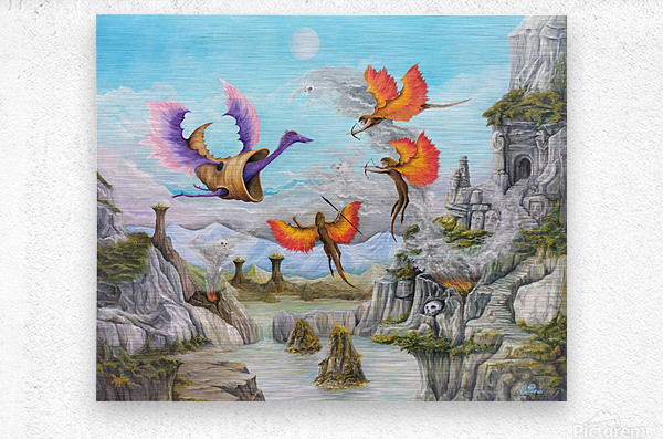 In this artwork by Gregory Pyra Piro, viewers are transported to a fantastical realm filled with eerie beings. Ghostly demons emerge from the clouds, while dragon-like creatures with horns and shell vests soar above. Lions and wolves combine to form flying creatures, and stone carvings of human faces and skulls dot the landscape. Lakes, streams, and waterfalls glisten with liquid water, surrounded by hills, mountains, and various structures. Staircases lead to tunnels under a moonlit sky against a blue backdrop. The painting is signed on the front at the bottom right.