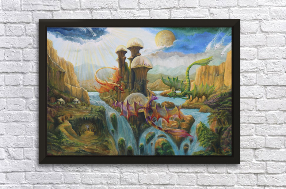 Within this surrealist artwork by Gregory Pyra Piro, a captivating scene unfolds, seemingly transported from an alternate reality. The canvas portrays mythical dragon creatures, their wings translucent as they gracefully soar through the air. The landscape is adorned with undulating hills, towering mountains, meandering streams, and cascading waterfalls. Verdant vegetation and trees thrive, enhancing the otherworldly ambiance. In the foreground, a cave beckons attention, where individuals gather around a crackling fire, while a tent settlement rests nearby. As one's gaze extends into the distance, futuristic buildings crown mesas, encased within bio domes, resembling domed cities. Mysteriously, ghostly demons in the form of skulls emerge from the clouds, adding an element of intrigue.