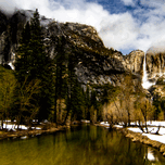 How glorious is Yosemite in winter, when the crowds are less, Bridal Veil Falls is framed by the Merced River and the valley is blanketed by a covering of new snow. Storms are frequent then and can be caught hovering over Half Dome and the surrounding mountains, adding to the ambiance of this historic area. We had a wonderful time with photographer friends and cherish this charming area.