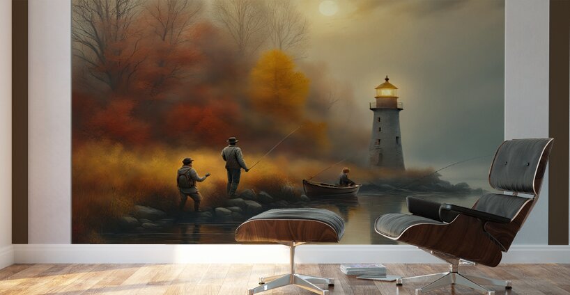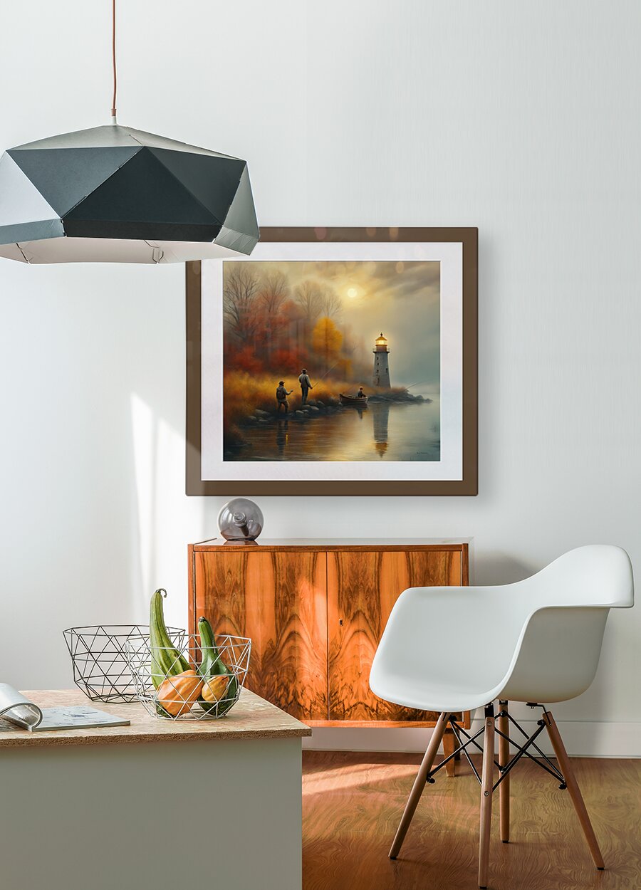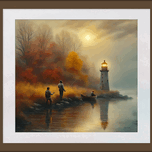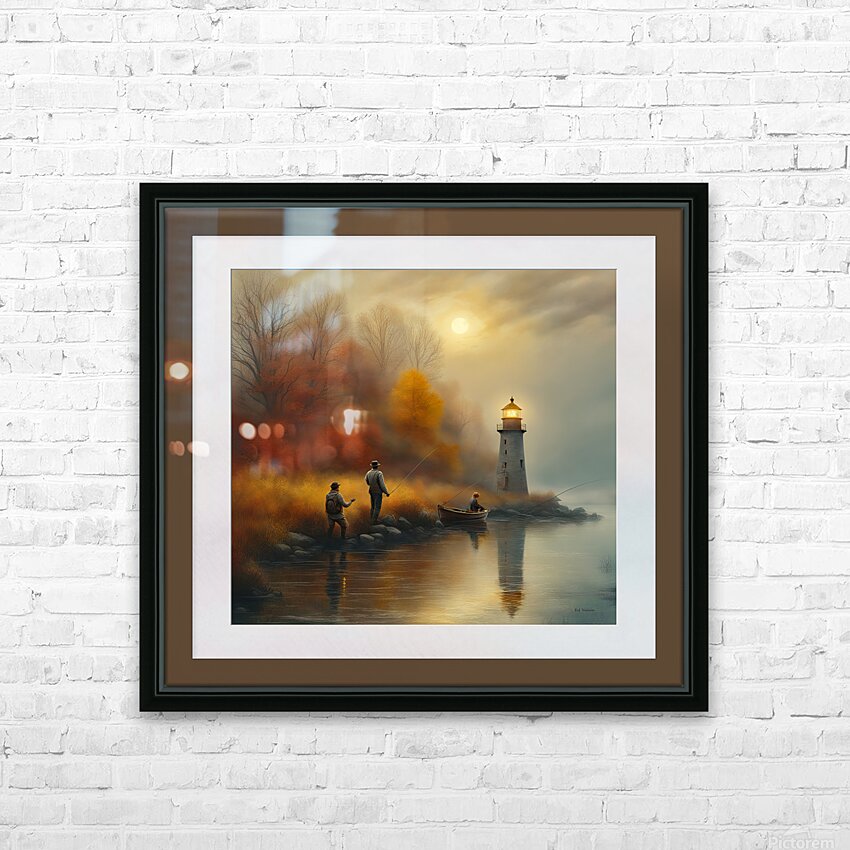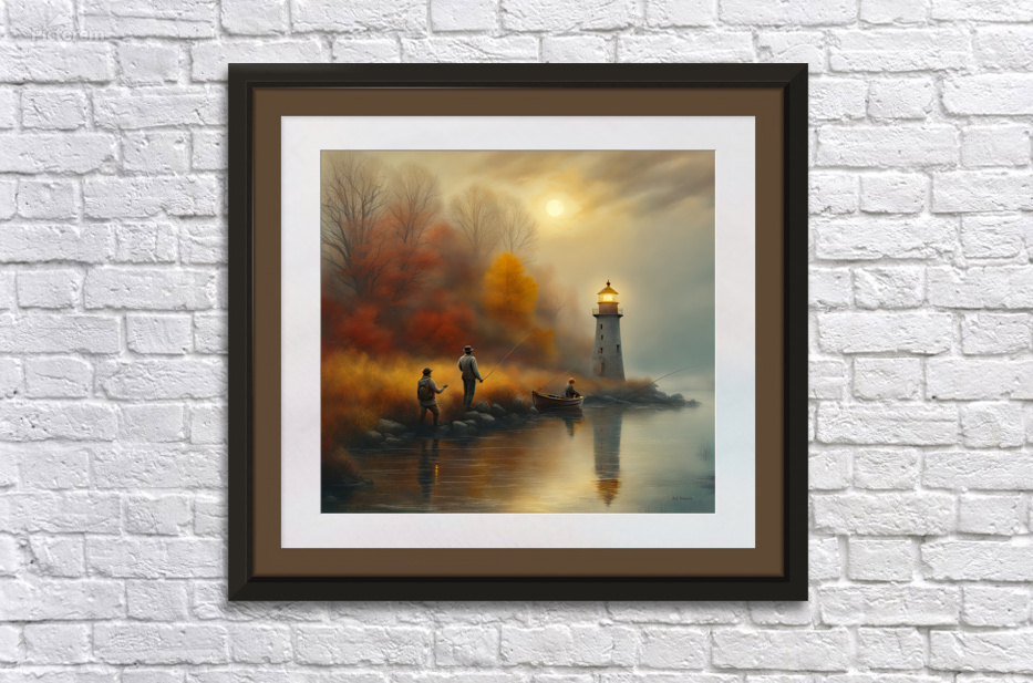 GAME WARDEN SNEAKS UP ON FISHERMEN TO CHECK THEIR FISHING LICENSES AND LIMITS. IMAGE HAS A WHITE MATTING AND FRAME COLOR BORROWED FROM BACKGROUND TO BLEND WITH COLORS IN SCENE. READY TO HANG. VIEW ON CANVAS.