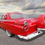 This classic 1956 red Ford Thunderbird car with a continental tire kit fitted on the rear to carry the spare wheel, was photographed at sunset. It has...[+]