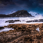 The first few days in the Lofoten Islands were full of challenges. There were gale force winds and low lighting because Norway is mostly in darkness in January. My husband watched from the car, holding his breath, knowing he couldn't protect me as I tried to protect myself and my equipment from the winds and rogue waves and still get the shot I wanted. I crouched behind a nearby boulder, close to the ground, trying to frame my shot. It was the only way I could hold the camera still enough to photograph, the winds were so strong even using a tripod. There was a tiny lull in the winds I was able to scamper to the boulder. There was enough light to shoot, but fast shutter speeds to catch the waves present problems. I had hoped to find wonderful tidal pools in this location, but instead found a raging sea ready to gobble me up if I wasn't careful.