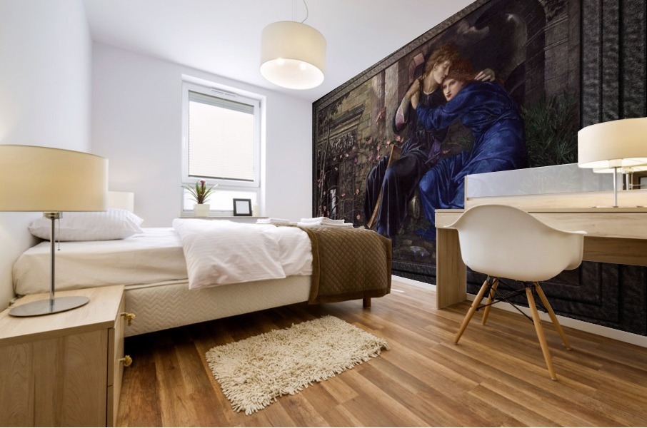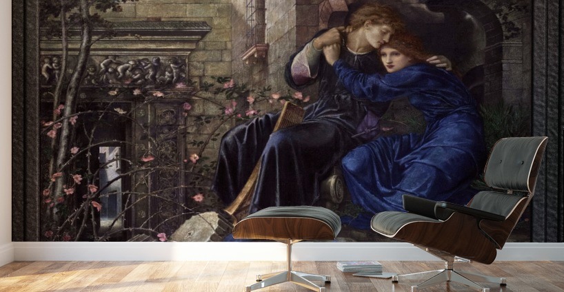 Love Among the Ruins c1873 by English Painter Edward Burne-Jones (1833 - 1898); a painter and designer associated with the Pre-Raphaelite Brotherhood, Aesthetic, and the Arts and Crafts Movements, as well as being a founding partner of Morris, Marshall, Faulkner & Co. a furnishings and decoratives arts manufacturer and retailer along with his partner William Morris. This is a retouched digital art old masters reproduction of a public domain image.