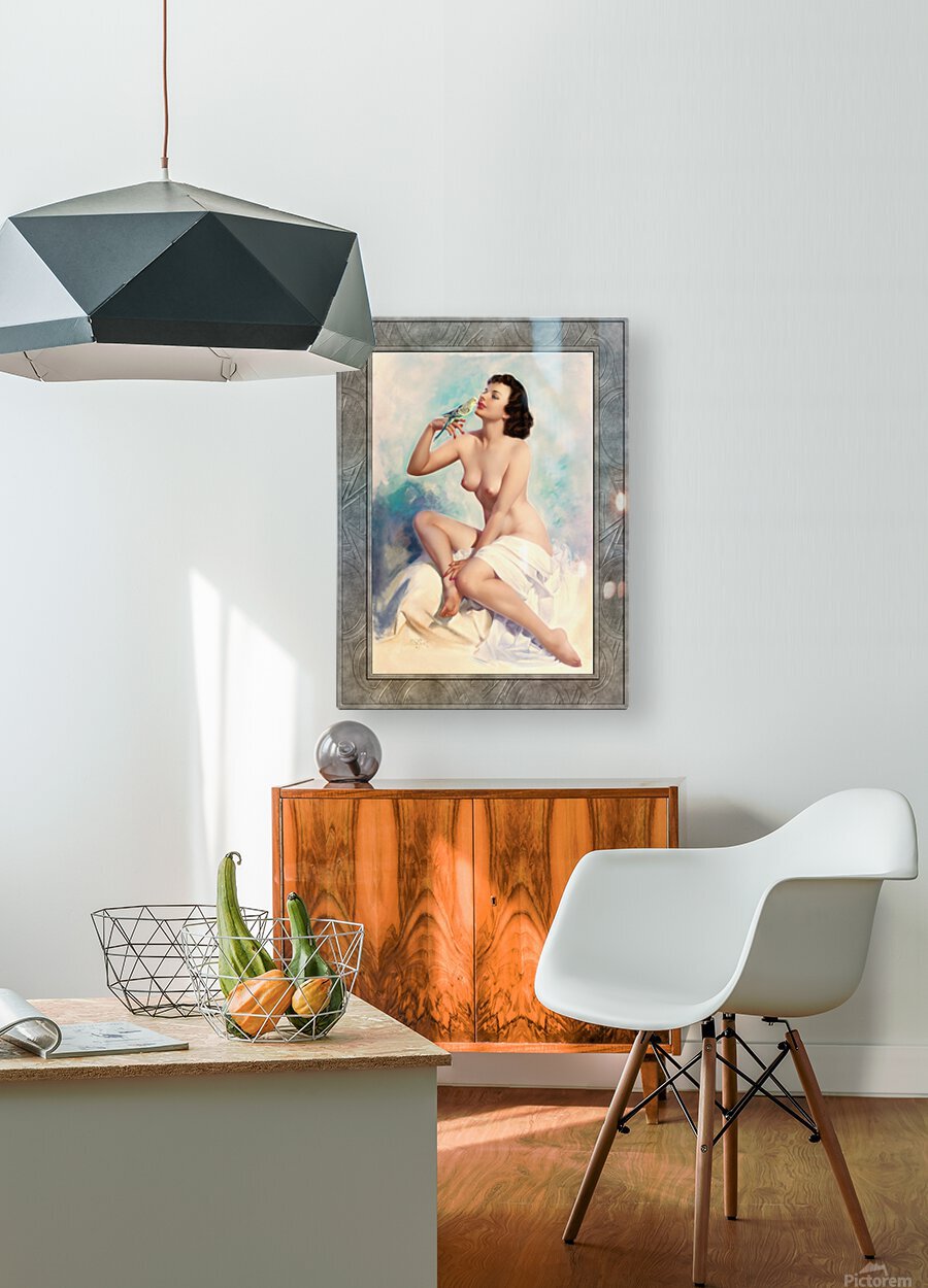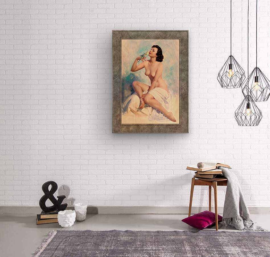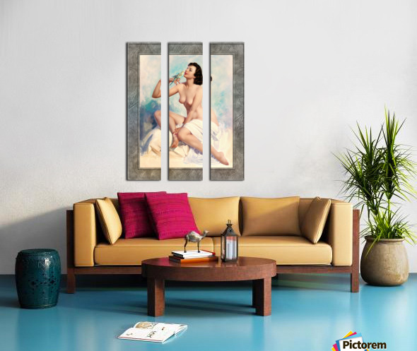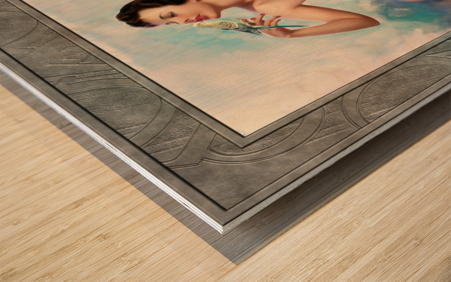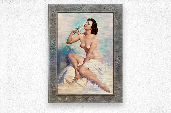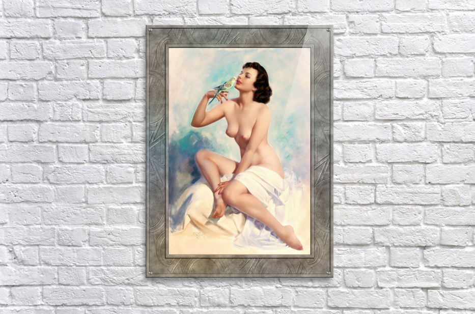 Morning Song by American Painter Zoe Mozert [Alice Adelaide Moser] (1907 - 1993); Portraitist, Pinup Artist and Pun-up Model. This is a sexy pin up girl portrait of a beautiful young brunette in her birthday suit with a parakeet that is sitting on the index finger of her right hand up to her ruby red lips as she listens to its morning singing. The young lady is covered around her left leg by a white sheet that contrast nicely with the golden tan large pillow that she is sitting on; while the background with its swash of white, blue, aqua, yellow, green and pink toned brush strokes highlight her beautifully. This is a retouched digital art old masters reproduction of a public domain image.