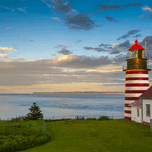 Sunset by weathered West Quoddy Head Lighthouse in downeast (northern) Maine, the easternmost beacon.