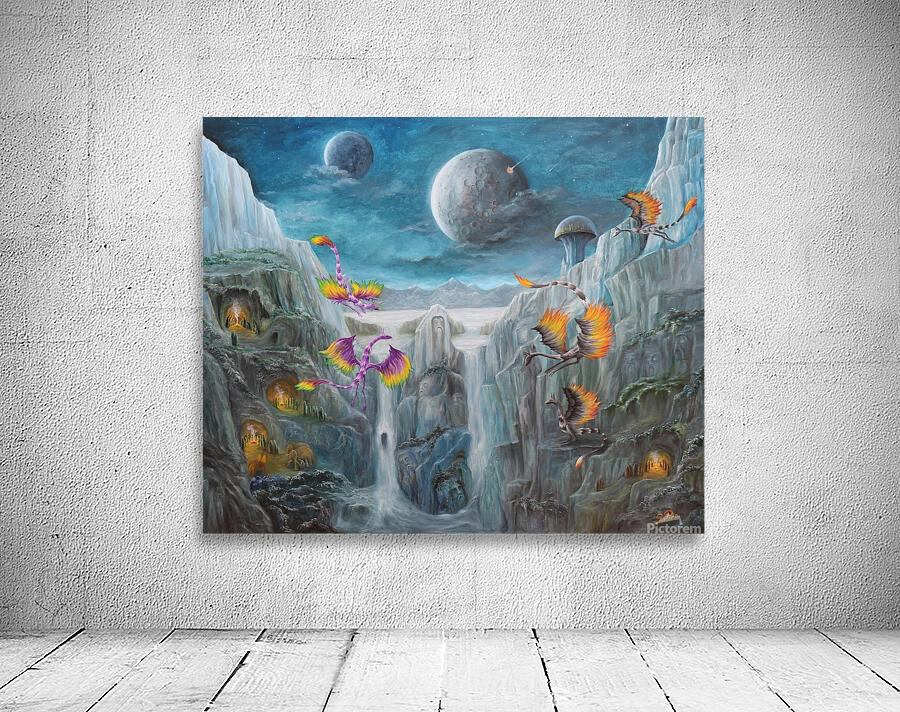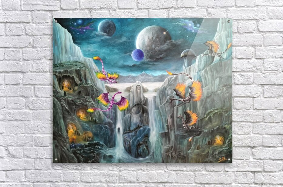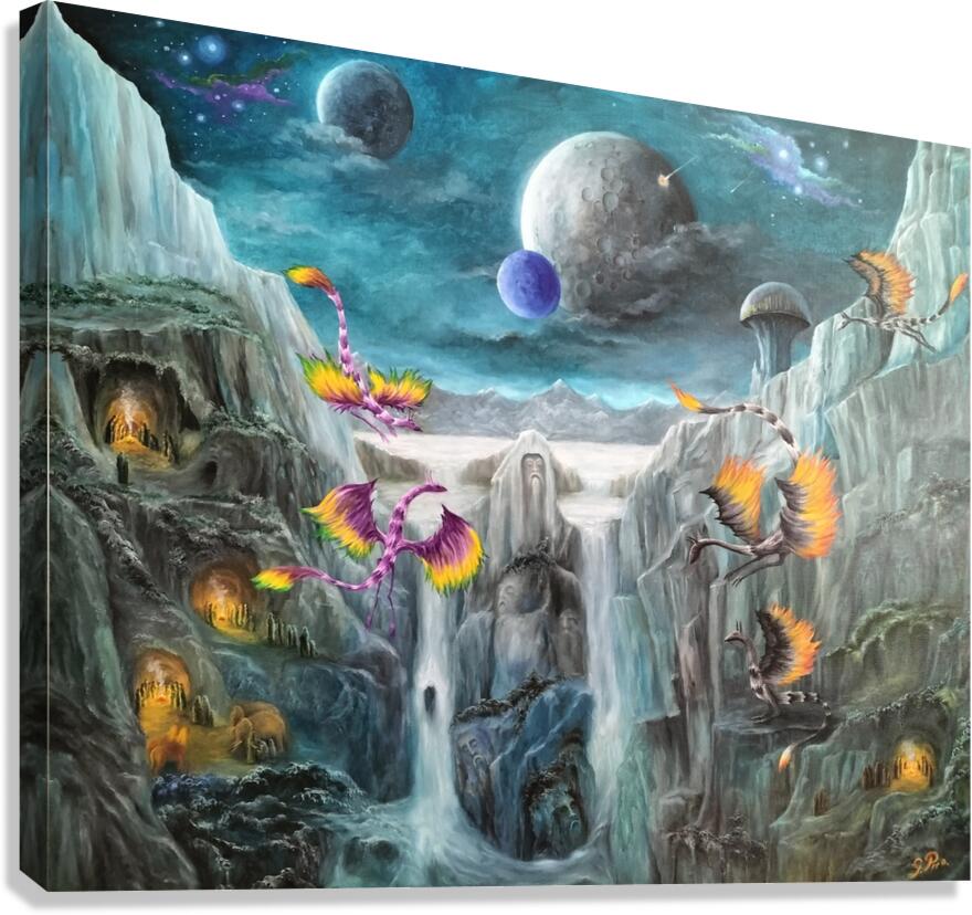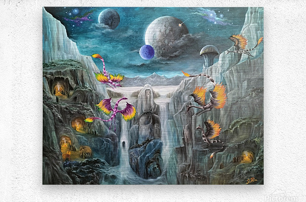 Gregory Pyra Piro's artistic creation takes the form of an oil painting that masterfully combines the styles of symbolism, surrealism, and landscape. The artwork presents a vibrant world brimming with colorful dragons, individuals, demons, and bio domes atop mesas. The sky above is painted in a serene shade of blue, featuring two moons adorned with distinctive craters. Futuristic buildings remain concealed beneath the protective shield of bio domes, while ominous skull-headed demons lurk amidst the distant clouds. Positioned at the bottom left of the painting, a group of people gathers around a crackling fire atop a bluff overlooking a flowing river. Gracefully gliding nearby are three majestic dragons.