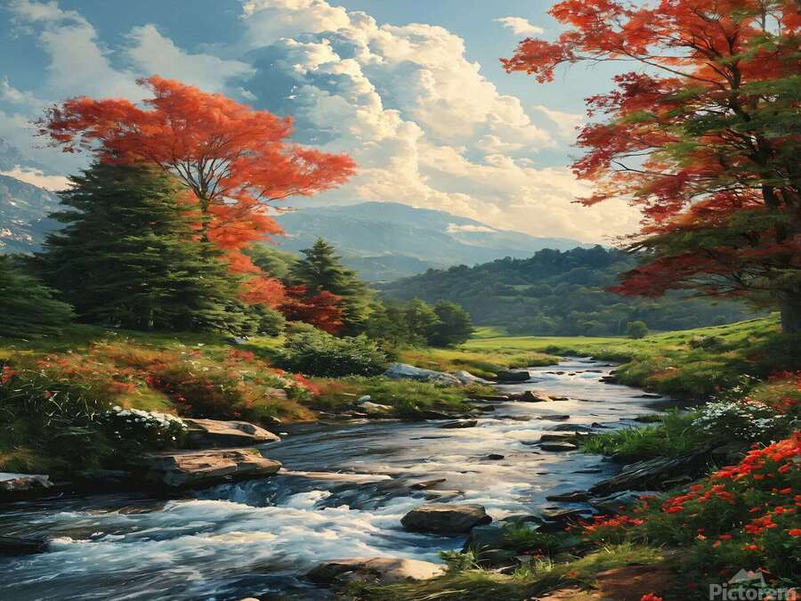 A serene painting depicting a mountain stream surrounded by vibrant red trees capturing the beauty of nature. by Megh25000 [+]