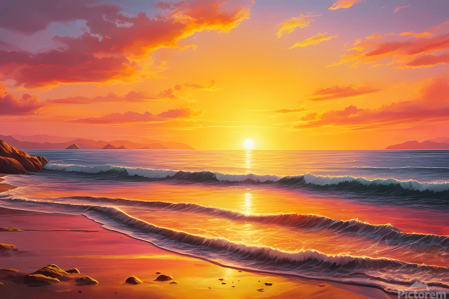 Golden Sunset Waves – Tranquil Beach Landscape Art by Sihemsoso [+]